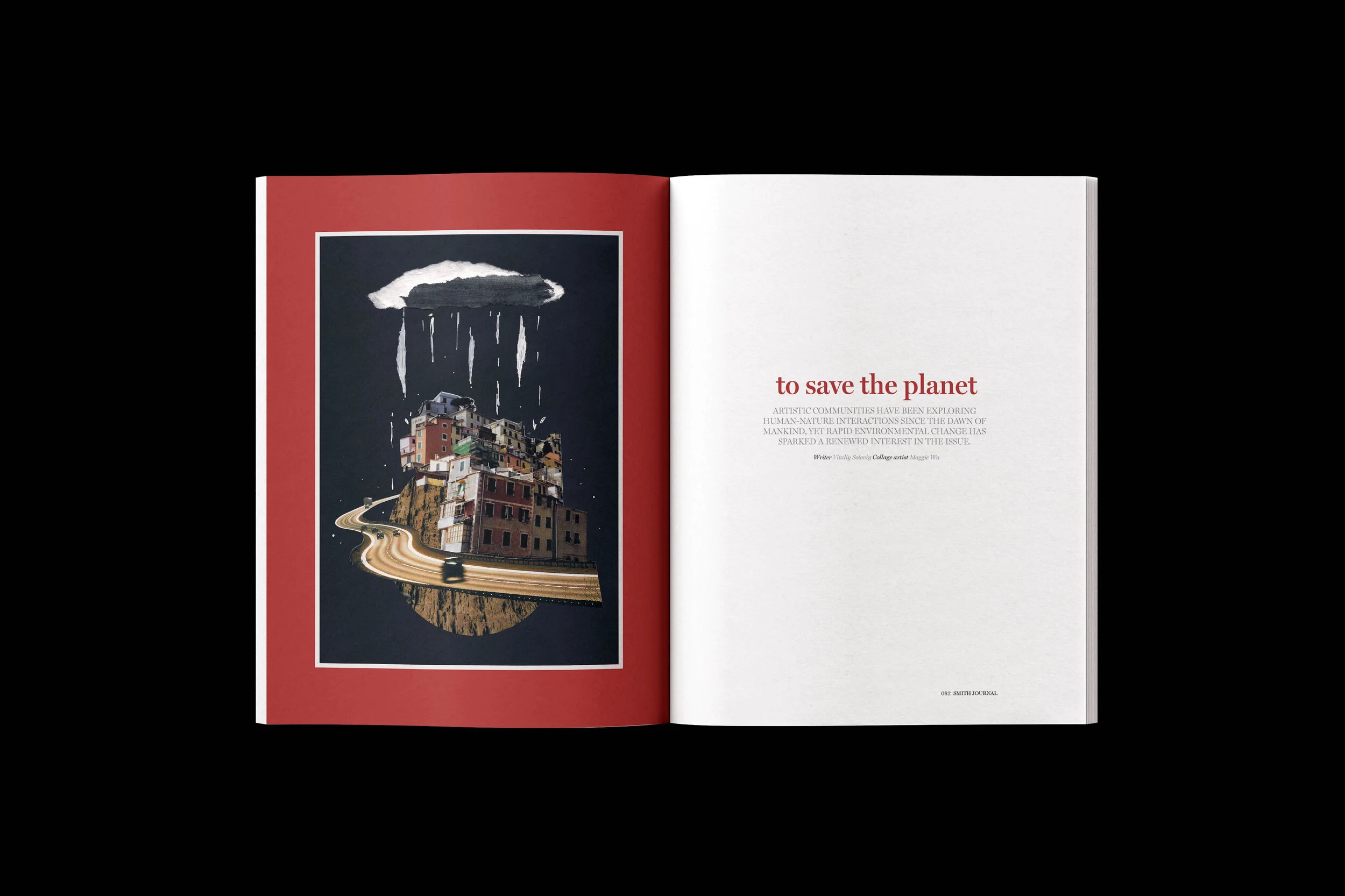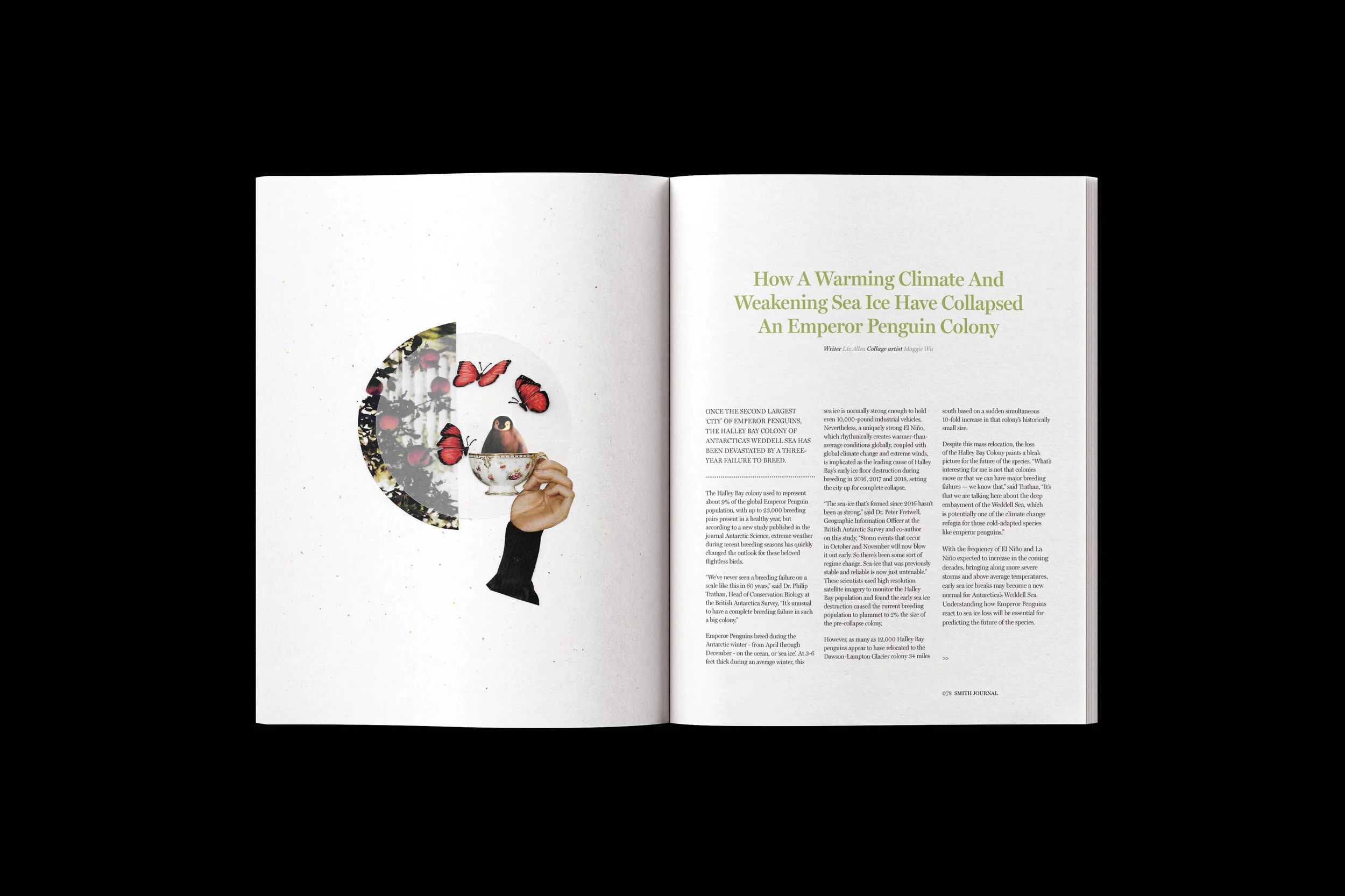 The newest Volume 00 of Smith Journal delivers fascinating stories and facts on the subject of climate change. The goal is to produce a cover design as well as internal graphics while experimenting with the technique of collage making using mixed media. The pieces explore relationship between the planet and mankind, displaying problems and possible future that the environmentally-conscious younger generations will soon be facing.